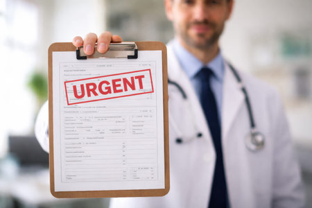 A doctor in a white coat shows an urgent medical form on a clipboard, indicating the need for immediate attention in a clinical setting.