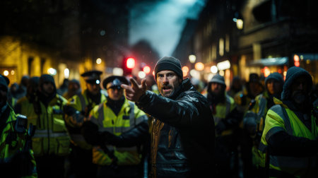 A British police officer monitors a nighttime protest in London, highlighted by vivid street lights and surrounded by a crowd in reflective vests.