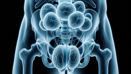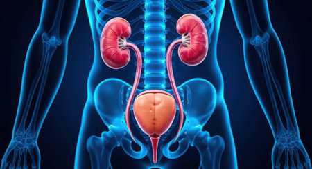 Illustration of human renal system with detailed kidneys, ureters, and bladder against a digital background