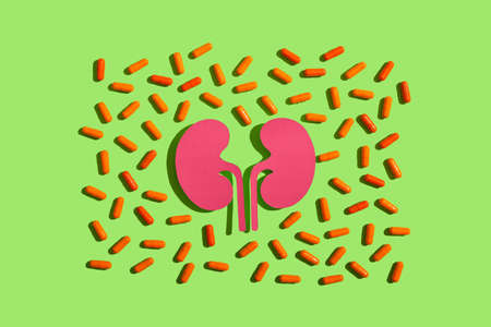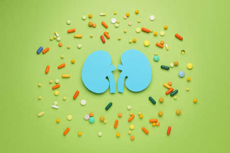 Paper kidneys and many pills on green background