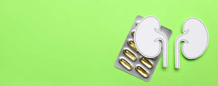 Paper kidneys and pills on green background with space for text