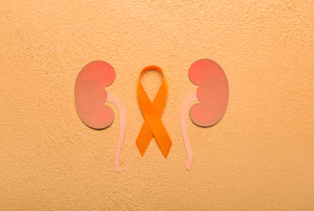 Orange awareness ribbon and paper kidneys on beige background