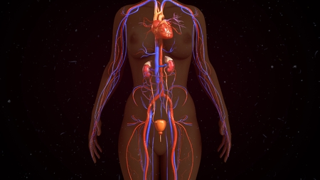 A close up of a pair of kidneys with red and orange blood vessels. The image is a representation of the human body and its internal organs