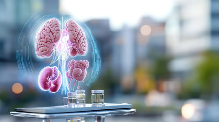 Holographic kidneys with digital circuits, futuristic medical theme, dark background