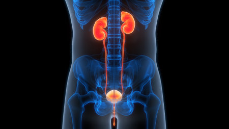 A detailed 3D rendering of the human urinary system, including kidneys, ureters, and bladder, highlighted against a dark background.