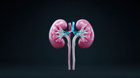 Human kidneys represented in a digital style. The kidneys are highlighted with detailed structures and connections focusing on biological functions.