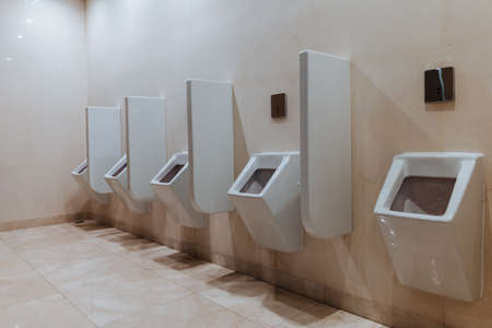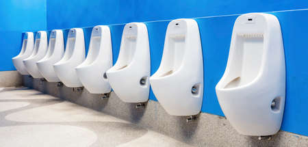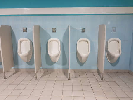 Row of white clean porcelain male urinals with partitions in airport terminal. Blue and white public restroom with white ceramic sanitary fixtures for urination for men. Comfort and hygiene concept
