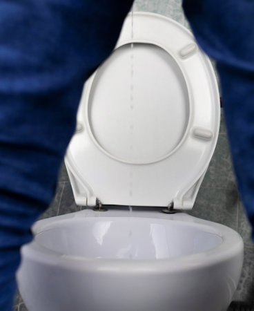 Prostatitis concept. Rear view of a man, hard to pee. Difficulty urinating with prostatitis. View of the toilet and the legs of a man. Imitation of urine with clear water. Sick in the toilet