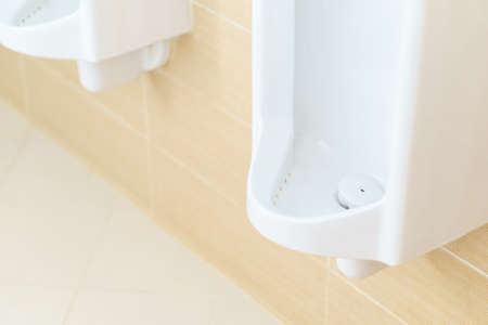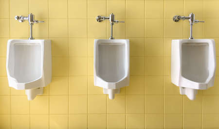 Close up row of outdoor white urinals men on yellow of wall public toilet.