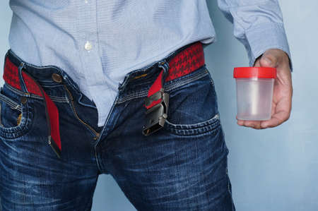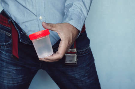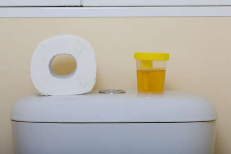 Urine in a container for analysis. Stands on the toilet cistern. Nearby is a roll of toilet paper. Disposable medical polymeric sterile container with a built-in holder for a vacuum test tube with a screw cap.