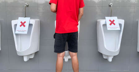 Social distance in washroom urinal. Covid 19 poster for washroom and toilet. People are maintain social distancing in office toilet. Keep distance poster for public toilet.