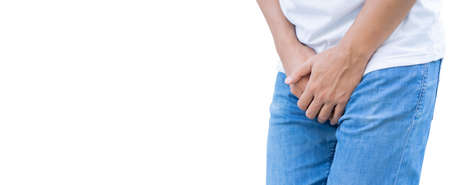 Young man holding his crotch suffering from Diarrhea, incontinence, prostatitis, venereal disease. Healthcare concept.