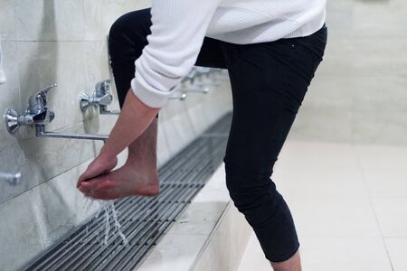 Muslim man taking ablution for prayer. Islamic Religious Rite Ceremony Of Ablution. Young Muslim man perform ablution (wudhu) before prayer.