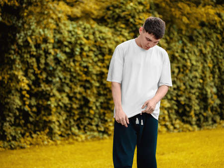 White t-shirt mockup on a young guy with his head down, standing on an autumn blurred background in the park, blank clothes for design presentation, print. Stylish men's clothing template, front view