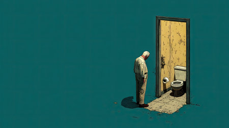 This artwork depicts an elderly man standing in front of an open bathroom door, symbolizing solitude and reflection on the journey of life. The minimalistic setting captures the essence of human emotion and contemplation.