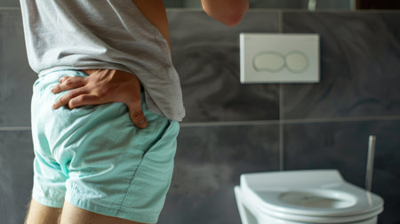 Male adult with both hands shielding buttocks area, suggesting discomfort or protection in health or social situations