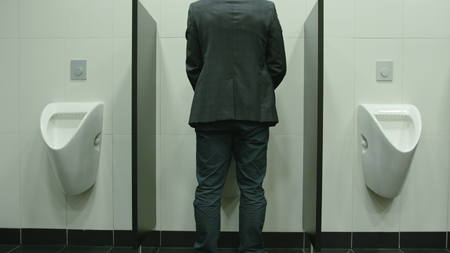 Prostatitis concept. Rear view of a man, hard to pee. Difficulty urinating with prostatitis. View of the toilet and the legs of a man. Imitation of urine with clear water. Sick in the toilet