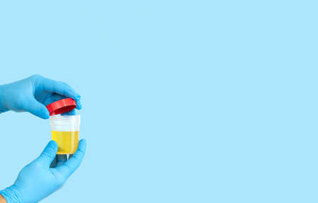 doctor in a white uniform and blue gloves on a blue background holds a plastic test jar with yellow urine. test for disease