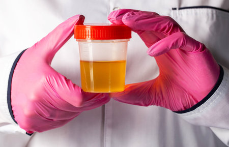 A focused medical professional examines a urine sample in a laboratory, demonstrating the precision and seriousness of clinical analysis. The individual wears blue latex gloves and a lab coat, highlighting the importance of hygiene and accuracy in medical testing.