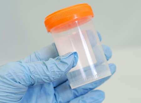 male doctor in a white coat holds a empty plastic container for urine specimen, wearing blue sterile medical gloves