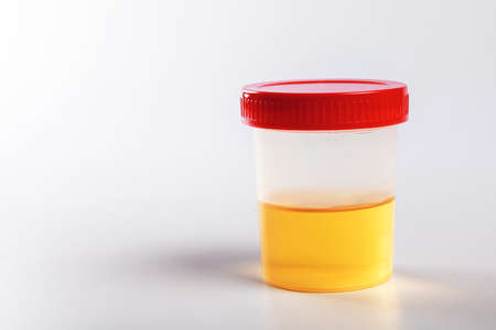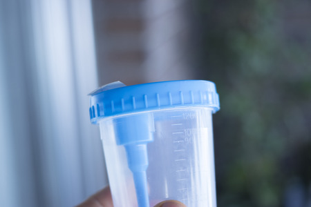 A doctor testing urine sample. Fresh specimen in a cup for examining.