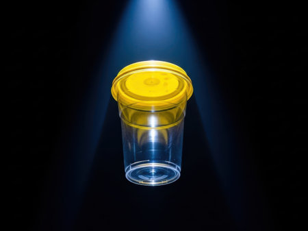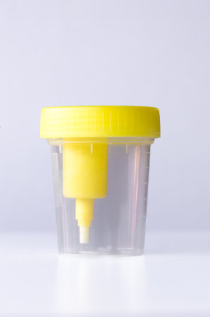 A plastic container for urine sample with a yellow lid. The container is likely used for measuring a liquid, such as medicine or a cleaning solution. Concept of medical analytics