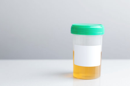 A urine sample in a clear container with a blue lid, ready for medical testing and analysis.
