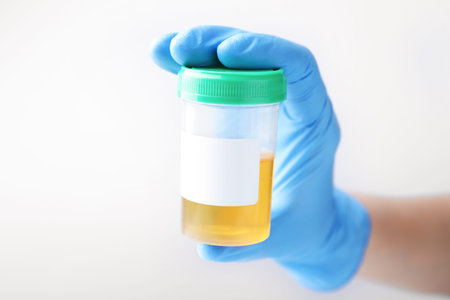 A focused medical professional examines a urine sample in a laboratory, demonstrating the precision and seriousness of clinical analysis. The individual wears blue latex gloves and a lab coat, highlighting the importance of hygiene and accuracy in medical testing.