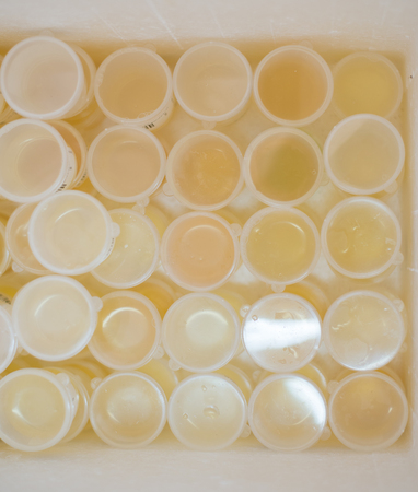 Semen analysis in a Bank. Sample sperm. Donor Sperm. Man health concept. Plastic container jar with sperm.