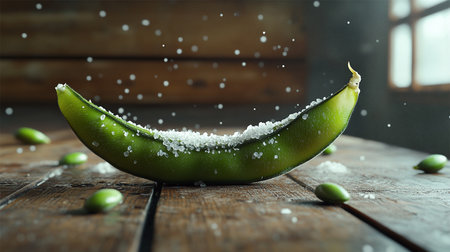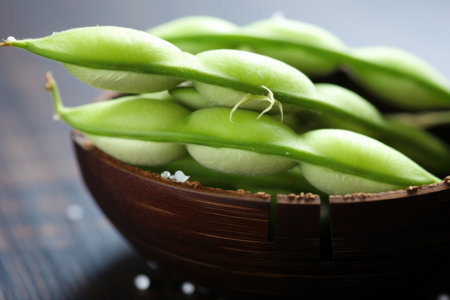 Edamame sprinkled with sea salt on a wooden bowl for a healthy Japanese snack