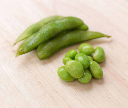 Fresh Green Edamame Soybeans Arranged on Rustic Wooden Table, Healthy Vegan Food Concept