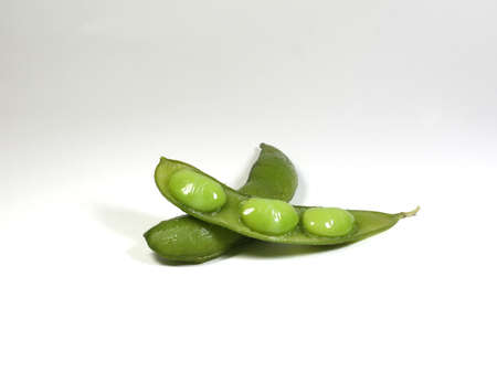 An opened pod of Edamame or soybeans is isolated on a turquoise background. Selective focus