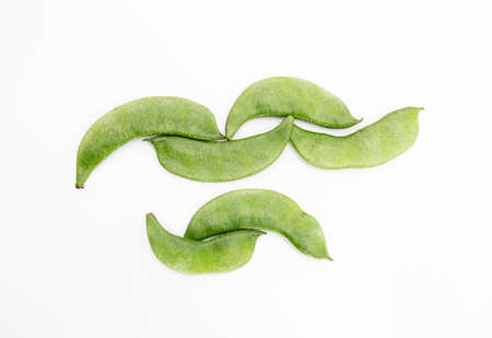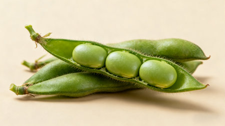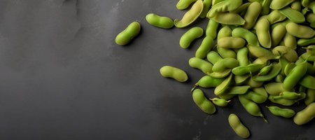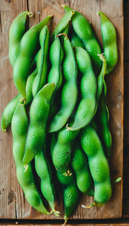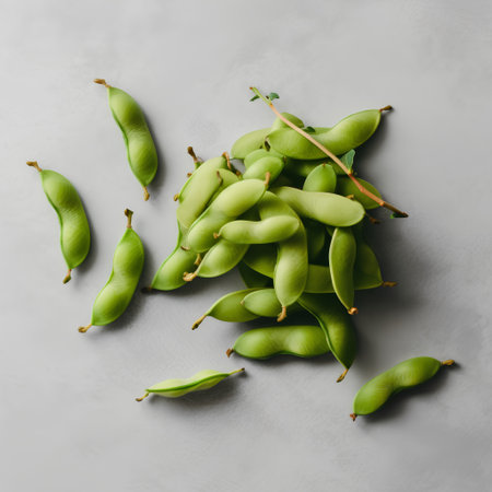 Fresh green edamame pods arranged on a simple background highlight their vibrant color and nutritional value, perfect for culinary use and healthy snacks.