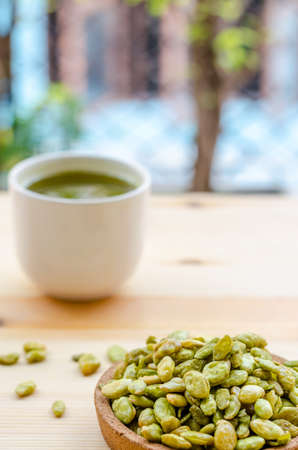 Organic Green Matcha Tea and edible seeds of hyacinth bean snack