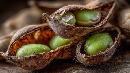A vibrant closeup captures a soybean pod brimming with plump, green soybeans, nestled among dried soybeans. Crisp leaves frame the rich textures of the beans and pod.