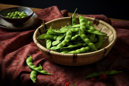 This image showcases fresh green edamame pods with a soft texture, placed against a neutral fabric background, perfect for healthy eating themes.