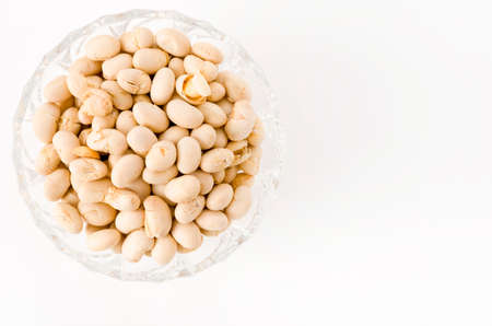Raw Organic Dry White Beans in a Gray Bowl, top view. Flat lay, overhead, from above. copyspace.