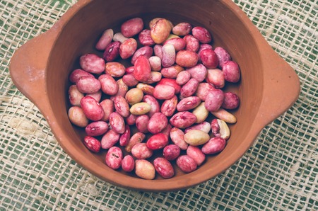 Raw pinto beans on small plate on wooden background. Healthy diet food