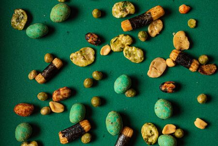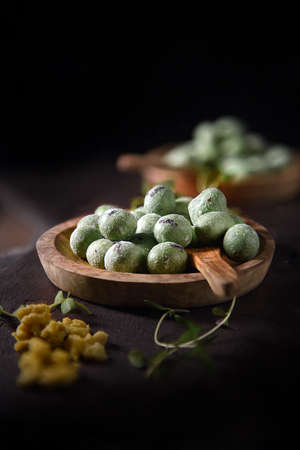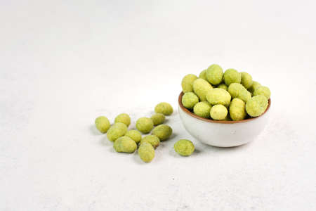 Pile of green wasabi coated peanuts in a bowl, spicy snack, oriental food