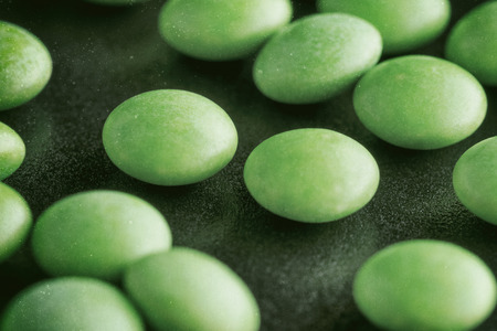 Green Tablets Or Drugs Circular Shape On A Black Background. Vintage, Grunge Version.