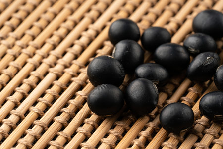 Shiny black kuromame beans, a traditional Japanese New Year's dish, are meticulously arranged in a decorative lacquered box.