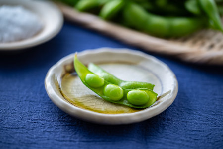 hand reaching for an edamame pod on a white ceramic plate, created with generative ai