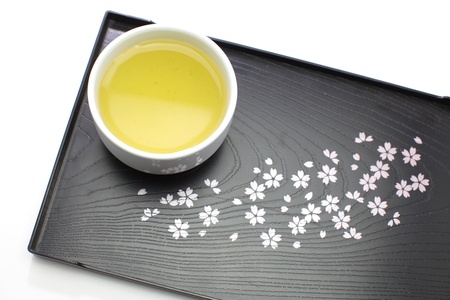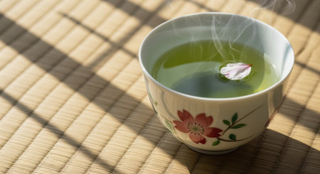 Steaming cup of fresh green tea with delicate cherry blossom petal floating, sunlight streaming onto traditional tatami mat background.