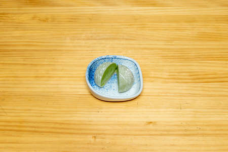 Above, ceremony and sweet snack with wagashi on tatami floor for traditional, serving and delicacy. Japanese, wellness and culture with chakaiseki in chashitsu room for season, event and Hatsugama