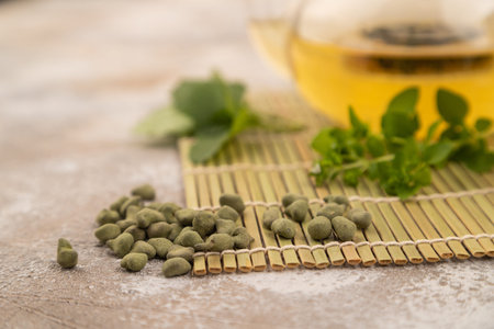 Green oolong tea with herbs in glass on brown concrete background. Healthy drink concept. Side view, close up, selective focus.