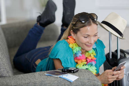young beautiful woman laying on sofa browsing her phone