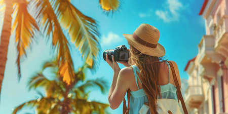 Woman tourist holding photo camera background, World Tourism Day - Ai Generated