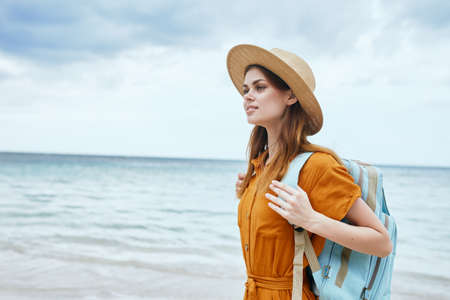 woman hiker backpack beach travel landscape vacation