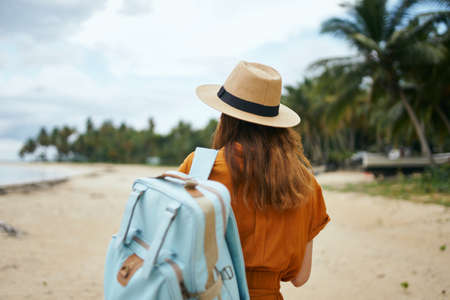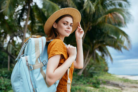 woman tourist backpack travel walk exotic palm trees
