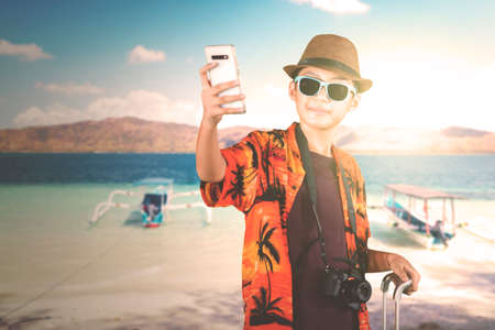 Preteen boy wearing summer clothes while taking a selfie photo by using a smartphone on the beach